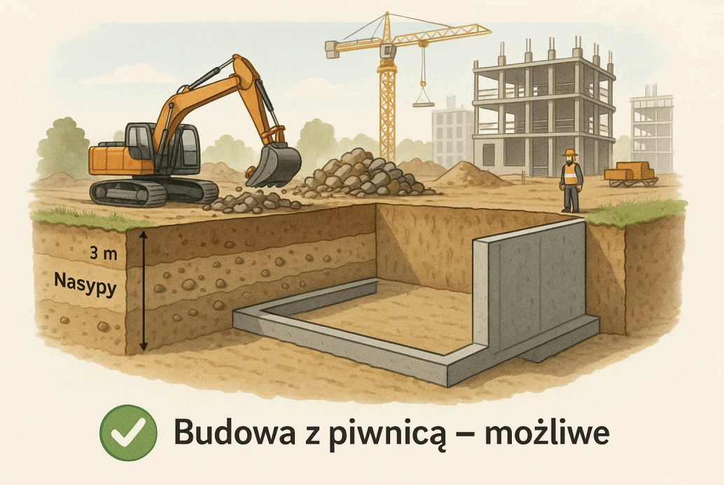 Na szczęście, ten inwestor miał inne plany – od początku zakładał wykonanie piwnicy. W związku z tym i tak musiałby usunąć 3 m nasypów, które w innych warunkach stanowiłyby problem. Grunty będą musiały zostać zutylizowane, ale w jego przypadku cała sytuacja okazała się zgodna z założeniami inwestycyjnymi.