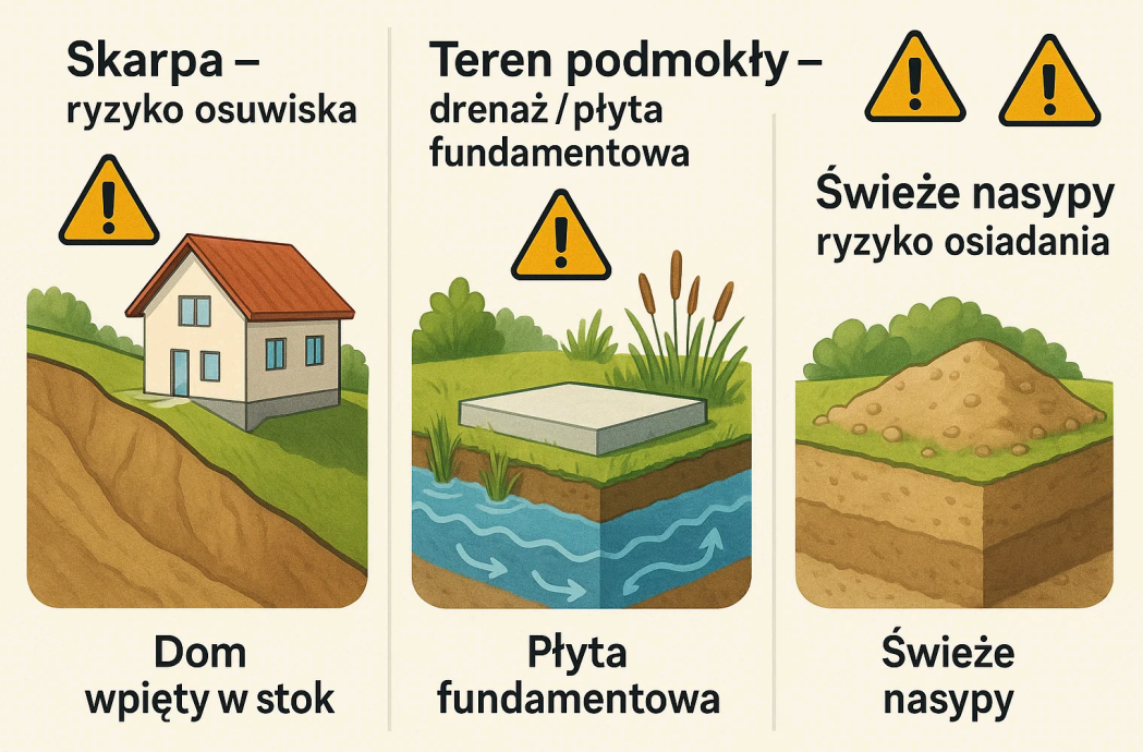 Jeśli na działce występują młode, świeżo formowane nasypy, doradzamy, jak uniknąć problemów z osiadaniem konstrukcji albo które części terenu są bezpieczniejsze do zabudowy.